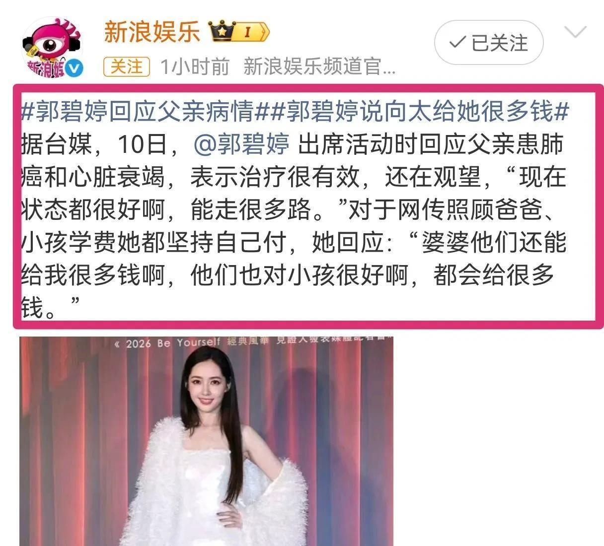 郭碧婷现在主要时间照顾家人,偶尔接点工作。对以后有什么打算,她没具体说,但强调要平衡生活和个人发展。这件事让大家看到豪门夫妻的相处方式可能和想象不同,具体怎么维持关系只能看他们自己了。 出道这么多年,郭碧婷一直保持低调。这次突然公开亮相,可能想打破大家对她的误解。不管是和婆婆关系还是分居,她选择自己处理。未来会怎样,只能看时间和事情发展了。